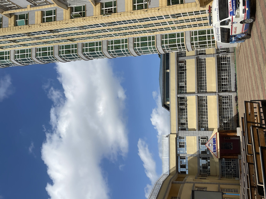 The image depicts an exterior view of an institutional complex under a bright blue sky with scattered white clouds. The scene is dominated by multiple buildings, a paved courtyard, and an ambulance. On the right, a multi-story building rises prominently, featuring a gray facade with numerous windows framed in white, many with a greenish tint. A distinct curved section with bay windows runs vertically along the left side of this tall structure. Some windows on its right side are partially open. In the center and extending to the left, a multi-level building with a lighter yellow-beige facade and gray structural elements is visible. Its numerous windows are rectangular with white frames and internal security bars. A central entrance on the ground floor is covered by a small red-roofed structure with a sign that reads "STAFF CAFE" in white lettering on a blue background. Another building with a dark-tiled, sloped roof is visible in the background, behind the yellow-beige building. In the paved courtyard area to the right, a white panel van, marked as an "AMBULANCE" from "Mount Kenya University," is parked. The ambulance features blue and red graphic elements and the website "MKU.ac.ke". In the foreground on the left, several rows of empty wooden benches with dark metal frames are arranged on the paved surface, suggesting an outdoor seating or assembly area. The ground is covered with light and dark patterned interlocking pavers. No individuals are visible in the scene. The location is identified as part of Mount Kenya University in Kenya, as indicated by the branding on the ambulance. The presence of an ambulance suggests a connection to healthcare services or medical training facilities associated with the university, which would typically include clinical areas or wards.