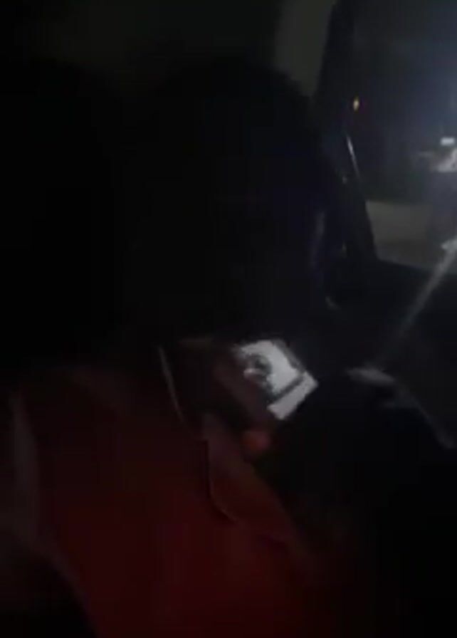 A person in a car, wearing light pink pajamas, is listening to music and talking. The interior of the car is dark, but a little light comes from a window and illuminates the person's face occasionally.
