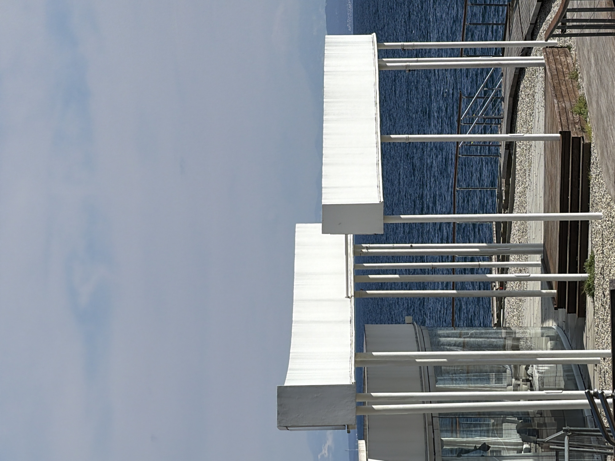 The image presents a modern coastal architectural scene in Grad Opatija, Croatia, under a light blue sky with scattered white clouds. The deep blue, calm Adriatic Sea extends across the middle and background, meeting a hazy distant landmass on the horizon. In the foreground and midground, several stark white structural elements are prominent. These include two elevated, large white panels, one distinctly curved and the other rectilinear, both supported by multiple slender, white vertical poles. To the left, a circular building with large glass windows and a white upper section is partially visible behind some of the supporting poles. The ground comprises light-colored gravel surfaces interspersed with wooden decking and walkways, including a raised wooden platform with integrated steps positioned centrally under the white structures. Metal railings with wooden top rails line the edge of the elevated walkways, overlooking the sea. A metal staircase with railings descends towards the water on the right side of the frame. No individuals, explicit actions, or interactions are observed.