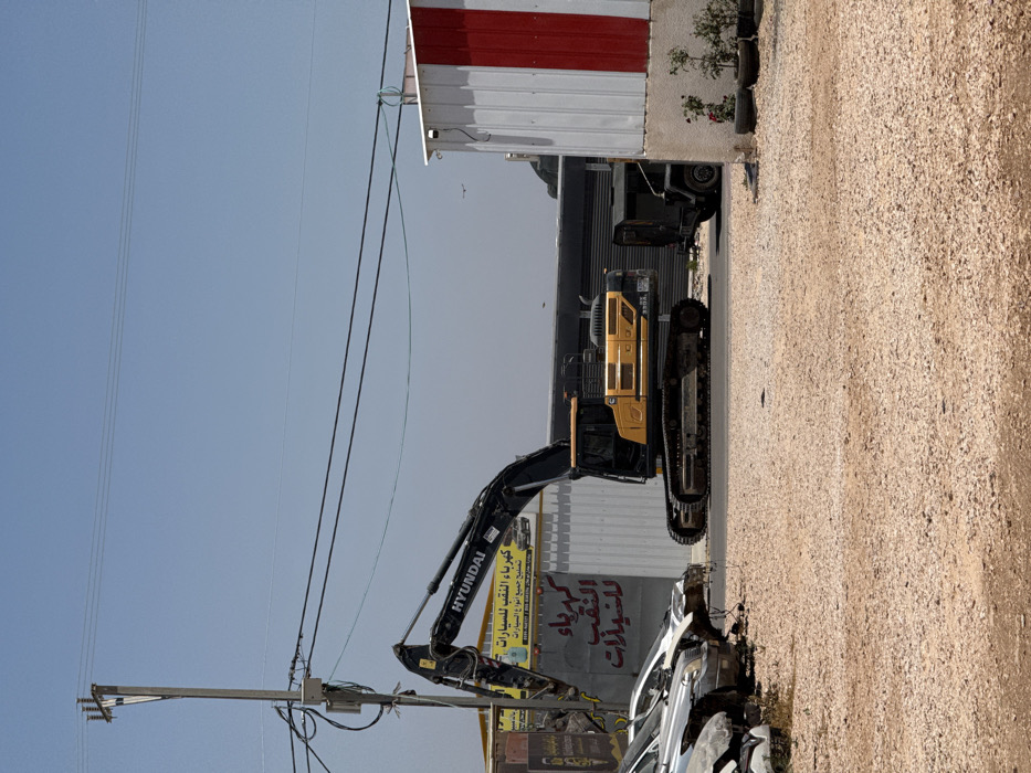 A yellow and black Hyundai excavator sits on a paved surface next to a dirt area. The arm of the excavator extends toward a pole with power lines. Behind the excavator is a white building with red trim. In front of the excavator is a pile of scrap metal. A sign is visible on a nearby building with Arabic writing. A vehicle is partially visible behind the excavator.