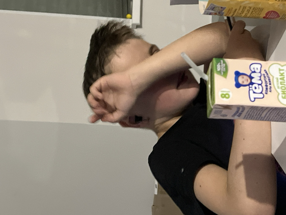 An interior scene captured in the city of Ketoshi, Russia, depicts a single individual seated at a light-colored surface. The subject, appearing to be a young person with short, dark hair, is visible from the chest upwards, wearing a black short-sleeved t-shirt. The individual's head is resting on their left arm, which is positioned on the table or counter. The right hand is raised, with fingers curled, near the forehead, obscuring part of the face. An earbud is visible in the left ear. In the foreground, slightly to the right of the center, is a carton of "Tёма" (Tyoma) brand children's biolact (fermented milk), approximately 200ml, with a white and light green design featuring a stylized baby bear face and the number "8+". A white plastic straw is inserted into the carton. To the right of this carton, a portion of another yellowish-brown carton is visible. The immediate surface beneath these items is white. The background consists of a plain, light-colored wall. To the far left, a stack of brown cardboard boxes is partially visible. To the far right, a segment of a window frame or similar white structure is present, with a small, yellow spherical object attached to it. The lighting is even but suggests an indoor setting, possibly artificial illumination. No direct interaction between the individual and other people or subjects is discernible; the person appears to be in a state of rest or contemplation.