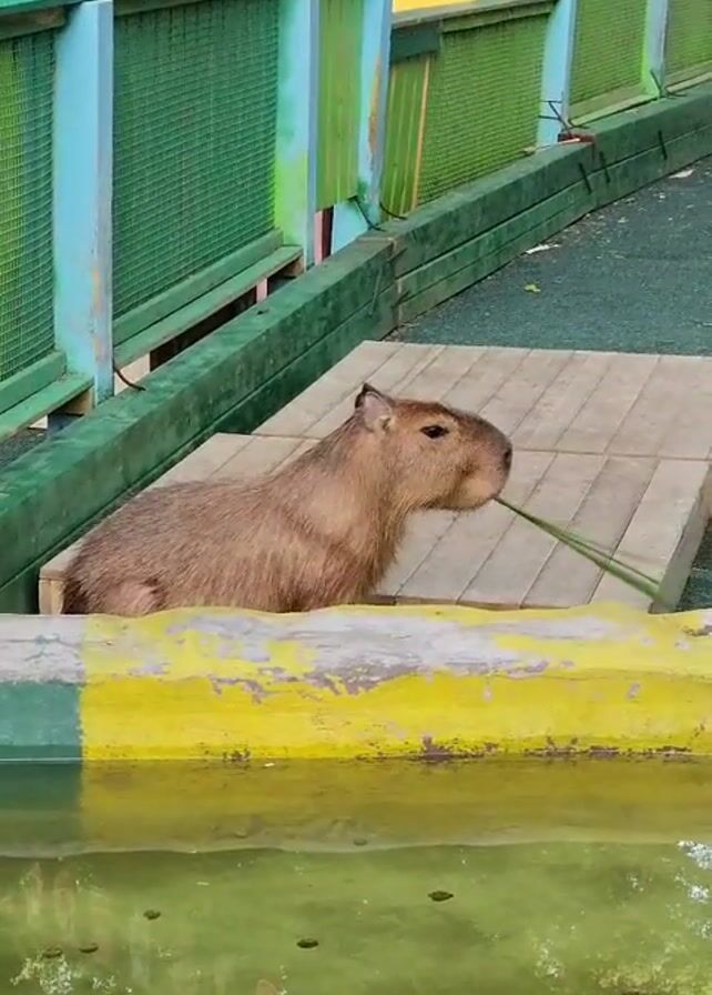 capybara standing on a small wooden platform next to a pond. The capybara is eating a few strands of green grass. The pond is small, and its water reflects the surrounding greenery. A colorful fence surrounds the capybara's enclosure.