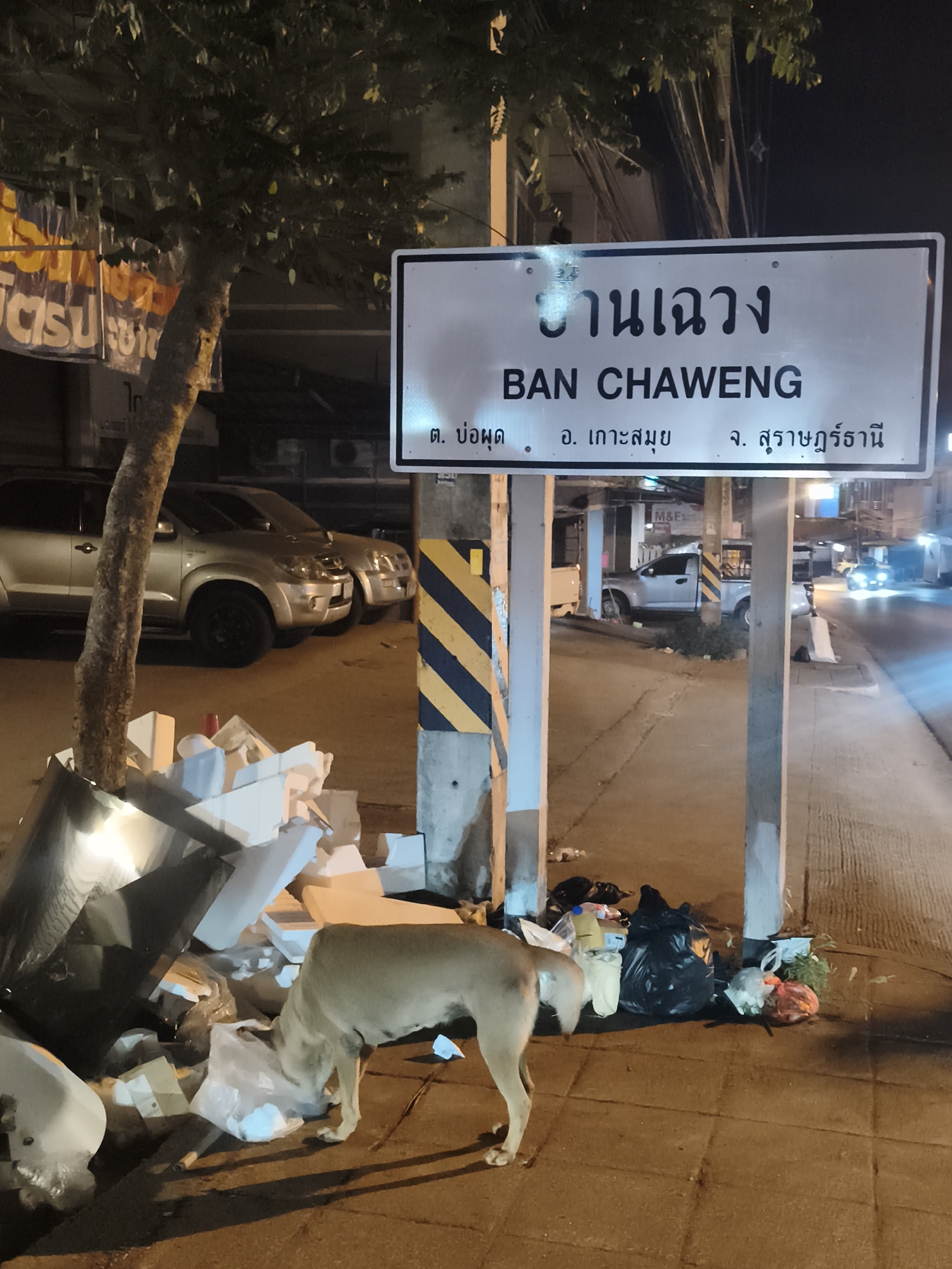 A dog rummages through trash in Baan Bo Phut, Thailand. A street sign identifies the location as "Ban Chaweng." The trash is overflowing around a utility pole with hazard stripes. A large trash can is filled with styrofoam, bags, and other debris. Trash bags lay open on the ground. Cars pass on the street behind the trash.
