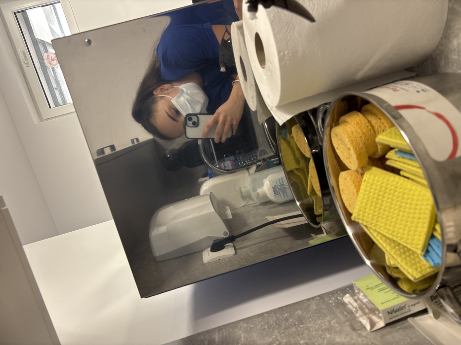 A female individual is captured in a mirror selfie, partially visible from the chest up, wearing a blue top or scrubs and a light blue surgical mask