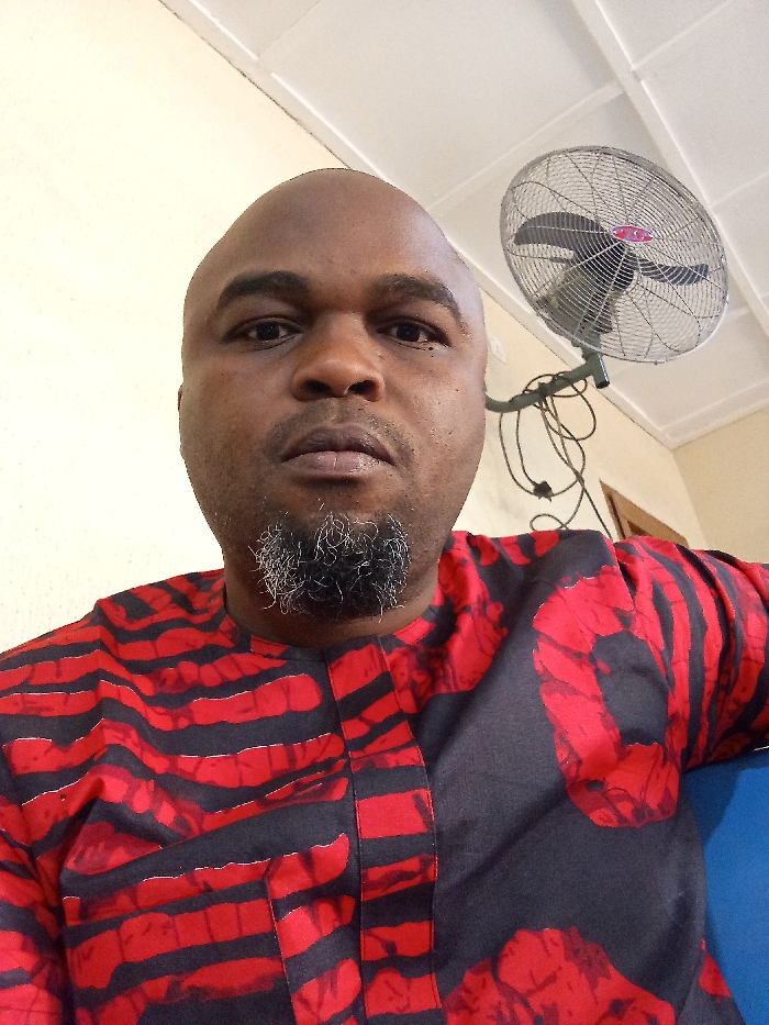An indoor scene in Hayin Banki, Nigeria, depicts an adult male posing for a photograph. The man has a dark complexion, a bald head, and a medium-length goatee with prominent grey hairs. He wears a long-sleeved garment featuring a pattern of irregular red shapes and stripes on a black background. His expression is neutral as he looks directly into the camera, occupying a significant portion of the frame. In the upper right background, a silver-colored, wall-mounted electric fan is visible, with several black electrical wires tangled beneath its mounting bracket. The walls and ceiling are light-colored, with white molding or trim on the ceiling. A small section of a blue surface, likely a chair or bench, is visible in the lower right corner behind the subject's shoulder.