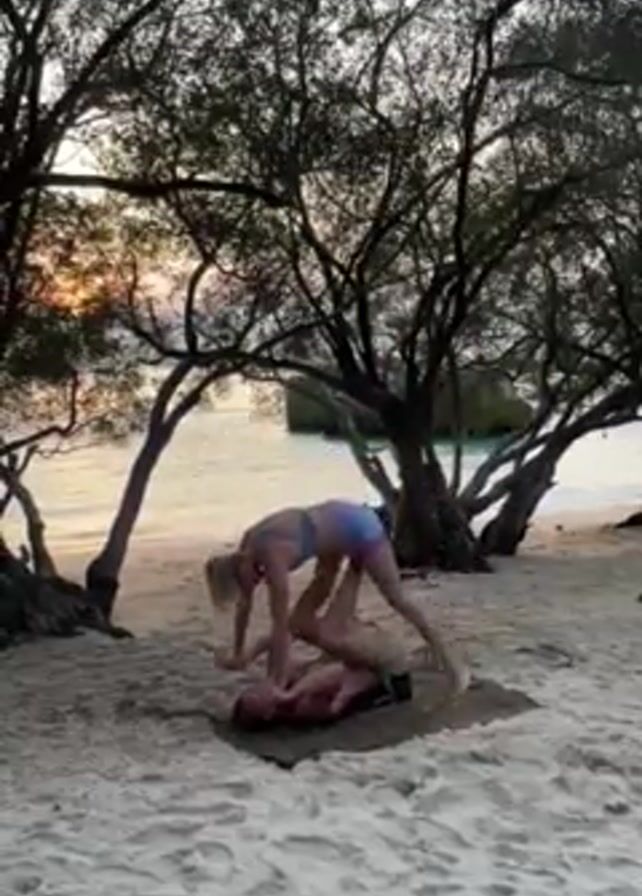 A man and a woman are on a sandy beach. The woman, wearing a patterned athletic top and bottom, is suspended above the man, who is lying on his back on a dark-colored mat. The woman is balanced on her hands, with her body extended horizontally, supported by the man's feet. She then rotates, balancing on her hands, until she is upside down with her legs in the air. She then falls off and runs away. The man remains on the mat. The scene is partially shaded by trees with gnarled branches. The ocean and sunset are visible in the background.