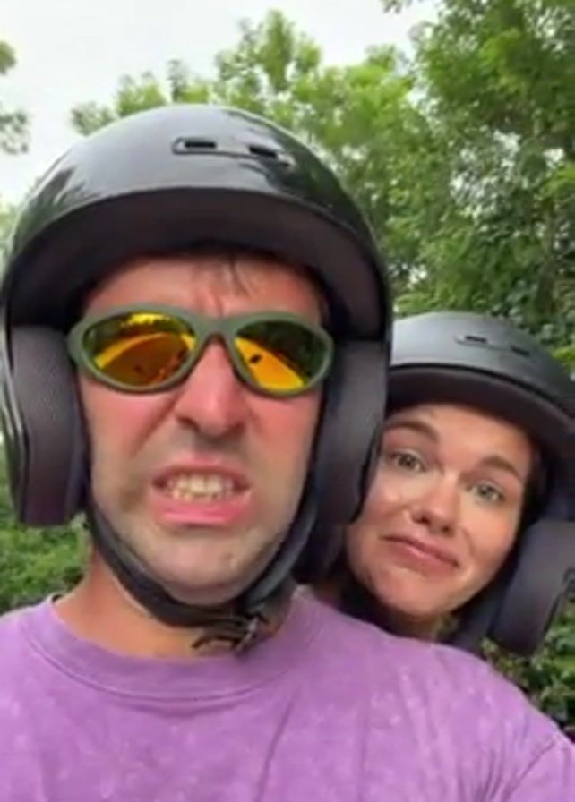 A man and a woman are riding on a motorbike, wearing helmets. The man is driving and looks concerned, wearing green sunglasses and a purple t-shirt. The woman is behind him and smiles at the camera. They are on a road lined with trees. The sound of monkeys is heard.