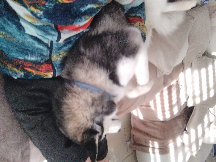 - "An indoor scene depicts a Husky dog resting on its back, with its paws curled, situated partially on a person's lap and partially on a multicolored blanket" by FM-M4lpO2, licensed under CC BY 4.0