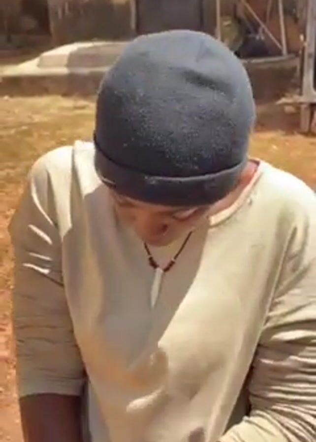 A woman wearing a black beanie and a light brown long-sleeved shirt is standing in an outdoor area. She is looking down and appears to be washing something in her hands. The background includes a building, a satellite dish, and some greenery. The ground has patches of red dirt. Music is playing in the background.