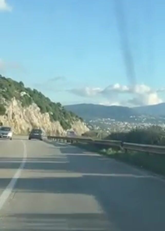 car driving on a highway. The highway curves along a cliff face. A town can be seen in the distance. The sky is blue with some clouds.