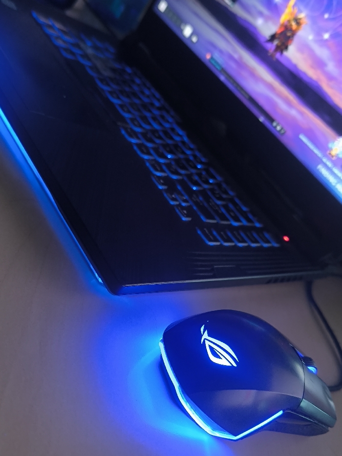 An overhead, oblique view depicts a gaming setup indoors in Sofia, Bulgaria, characterized by ambient blue illumination. A black laptop, likely a gaming model, occupies the left and central portion of the frame. Its keyboard features individually backlit blue keys, and a thin, continuous blue LED strip illuminates its front edge. A small red indicator light is visible near the upper right of the keyboard area. The laptop's screen, angled upwards, displays a blurred image of what appears to be a video game, featuring a character with glowing elements against a predominantly purple and pink abstract background. To the right and foreground of the laptop rests a black Republic of Gamers (ROG) gaming mouse. The mouse exhibits a prominent, illuminated ROG logo on its top surface and has additional blue LED accents along its perimeter, casting a blue glow onto the light-colored surface beneath it. A black cable extends from the right side of the mouse. Both devices are positioned on a flat, light-toned surface. No individuals are present.
