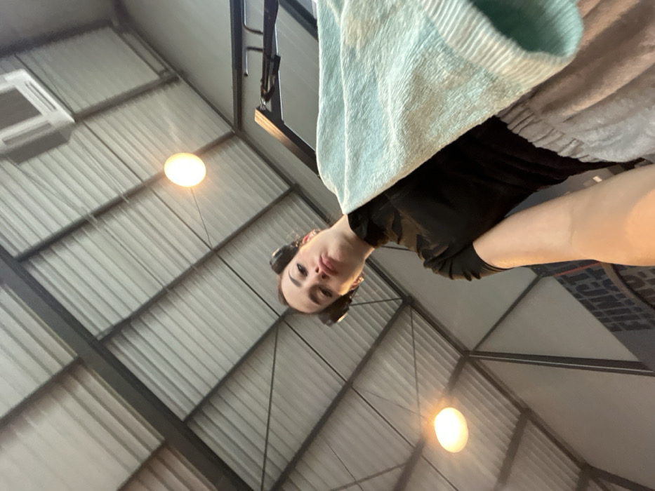 A low-angle selfie depicts a young adult female within an indoor fitness facility, located in Hœnheim, France