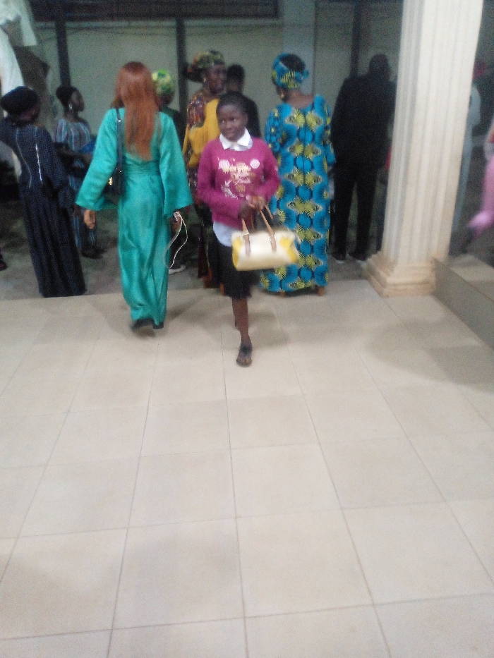 A young girl walks forward, clutching a large cream and yellow bag. She is surrounded by people in colorful attire, including a woman in a long turquoise dress and a woman in a blue and yellow patterned dress. The setting appears to be an indoor space with light-colored tiled floors and a large pillar in the background. Others are also present, some wearing darker clothing and head coverings.