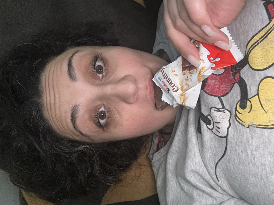 A fair-skinned woman lies on her side eating a Kinder Country chocolate bar. She has dark curly hair with a few gray strands, and light brown eyes that are wide. Her lips are open around the chocolate. She is wearing a light gray Mickey Mouse t-shirt. Her nails are long and polished in a clear or light color.