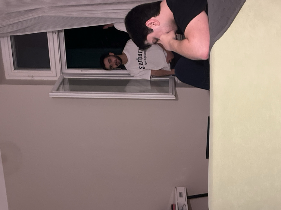 The image displays an indoor scene, consistent with a residential interior in Grad Rijeka, Croatia, during nighttime hours. In the foreground, a large, pale, light-colored surface, possibly a bed or sofa, occupies the lower portion of the frame, partially covered by a dark grey blanket on the right side. A male individual, with dark short hair and wearing a black short-sleeved shirt, is situated on the right side of this surface, facing left and slightly downwards. His right forearm rests on the surface, with his right hand covering his mouth and nose area. Behind this individual, centered in the midground, a second male is positioned within an open, white-framed window. He has a beard, dark short hair, and wears a white short-sleeved t-shirt with dark, stylized text on the chest, where "Sarbarr" is legible on the upper line. He is looking directly towards the camera with a neutral expression. To his right, partially obscured by a light-colored curtain and the window frame, a third male is visible, also wearing a white t-shirt, with only a portion of his head and torso discernible. The area visible outside the window is dark. On the far left of the image, a white desk with a single drawer and black legs is partially visible, with an unidentified dark object resting on its surface. The room's walls are light-colored.