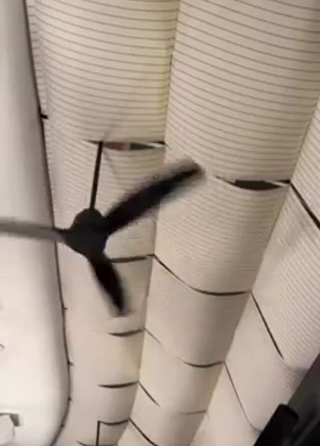 The camera points upwards to a white ceiling with black horizontal stripes