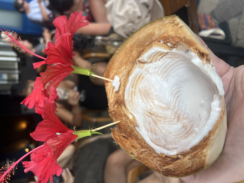 A human hand holds an open, young coconut. The coconut's exterior husk is light brown and fibrous, while its interior reveals a white, textured layer of coconut flesh and some visible liquid. Two vibrant red hibiscus flowers, each with a prominent red pistil and yellow-tipped stamens, are inserted into the top of the coconut husk using thin wooden skewers. A small, white, amorphous decorative item is affixed to the skewer of the right flower. The scene takes place indoors, within a restaurant or bar setting in Baan Hua Thanon, Thailand. In the blurred background, multiple individuals are present; one person on the left is holding a mobile phone, and another in the mid-background holds a stemmed glass. Ambient lighting is soft, and elements of seating and structural decor, including a partial blue wall, are discernible.