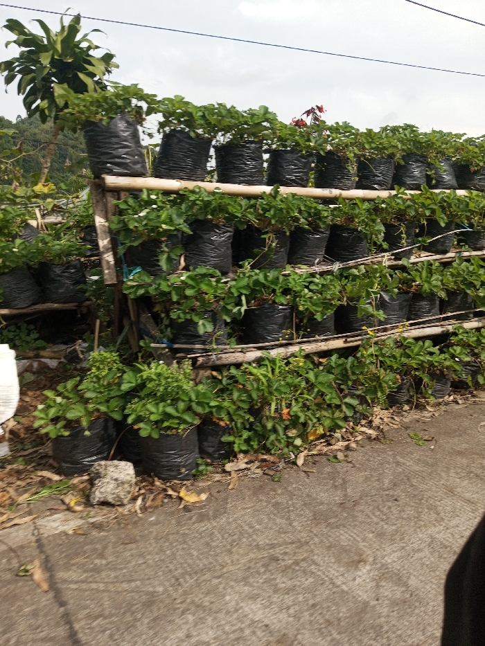 The image presents a multi-tiered vertical garden in Kandenuwara, Sri Lanka. Numerous strawberry plants, characterized by green foliage and small white blossoms, are cultivated within individual black plastic grow bags. These bags are systematically arranged on a rustic framework constructed from vertical wooden posts and horizontal bamboo poles, forming at least four distinct tiers. The structure stands immediately adjacent to a concrete or asphalt pathway, which has scattered dry leaves and small rocks along its edge. In the background, a dense, verdant hillside or mountainous terrain rises under an overcast sky. Thin utility wires are visible stretching across the upper portion of the frame. No human subjects or specific actions are depicted.