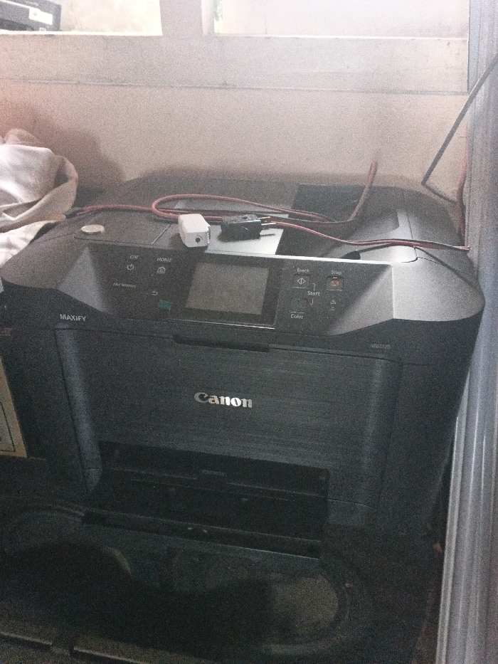 The image depicts an indoor scene in the city of Dogsenang Gorphoog, Bhutan. A black Canon MAXIFY MB5370 multifunction printer, identified by "Canon" and "MAXIFY" branding, is centrally positioned. Its control panel, featuring various buttons (e.g., Power, Home, Back, Start, Stop, Color) and an unlit LCD screen, is visible on the top surface. Resting on the printer's top are a white USB wall charger/adapter, a black two-pronged electrical plug, and a loosely coiled red cable. To the left of the printer, a crumpled light-colored fabric object is partially visible. The background consists of a light-colored wall, possibly with an unseen window above providing diffused light. A vertical metallic or plastic trim piece and a dark cable run along the right edge of the frame. No individuals are present.