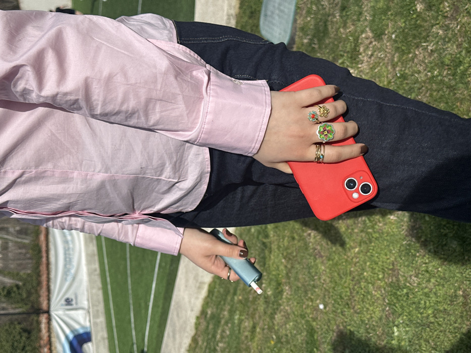 A person wearing a pink button-down shirt and blue jeans is standing on a grassy area in Segovia, Spain. They are holding a red smartphone in their right hand. The smartphone is in a red case and has a triple-lens camera system. They are also holding a silver vape pen in their left hand. The person has several rings on their right hand, including a gold ring with a green and blue flower design and a gold ring with a red gem. They are standing next to a green artificial turf sports field. There is a white line on the field. The background of the image shows a white sign and a green fence. The coordinates provided place the location in the city of Segovia, Spain, near the Puente de Hierro, a pedestrian bridge over the Eresma River.