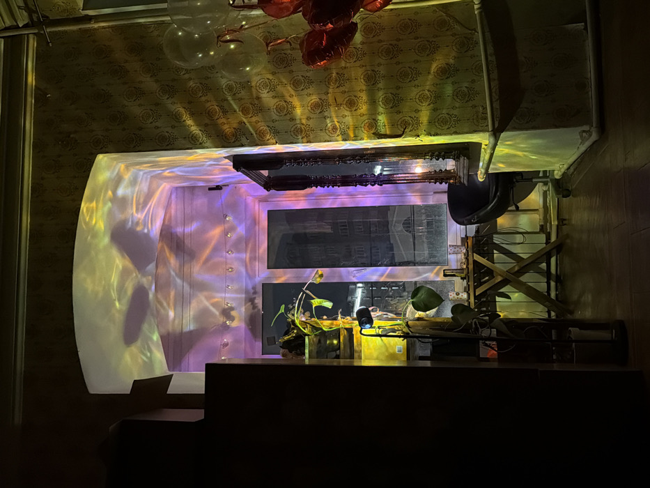 A dim interior view showcases a window adorned with decorative lighting effects. Above, balloons are visible near an ornate ceiling with patterned wallpaper. Below, plants rest on a dark surface, possibly a counter or ledge. Reflected in the window are outlines of buildings. To the right, a ladder-like wooden structure is partially visible. The space is filled with a mix of shadows and bright, refracted light.