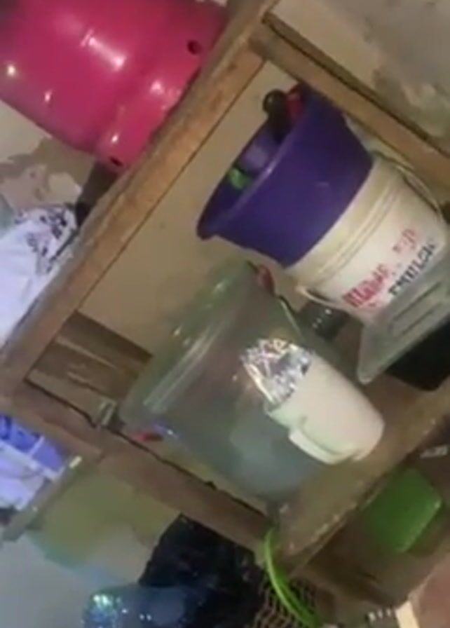 The camera focuses on a three-shelf wooden structure indoors. The top shelf holds a pink gas tank and a white bucket with a purple rim. The bucket has items inside. The middle shelf contains a clear plastic bin with a white cup covered in foil inside. The bottom shelf has a dark, wicker-like item, and the floor has blue and green decorative lights. Smoke appears to be emanating from the middle shelf area. The camera moves slightly, changing the angle of view.