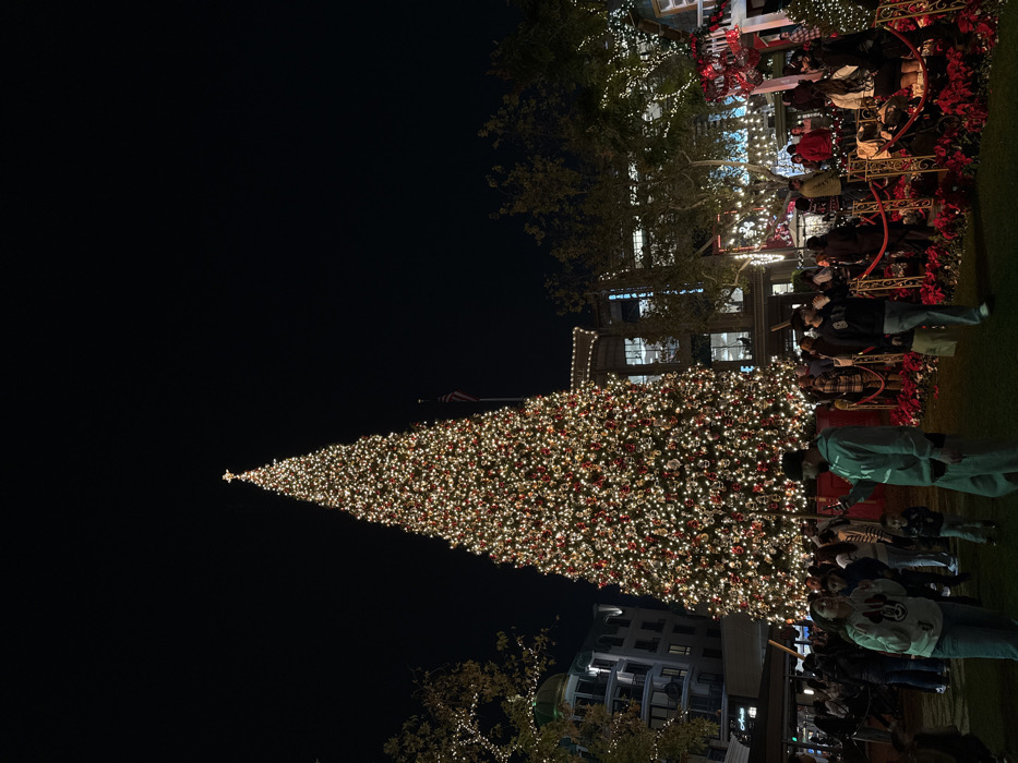 - "A large Christmas tree, illuminated with numerous white and red lights, stands against a dark night sky" by FM-zH4kC3, licensed under CC BY 4.0