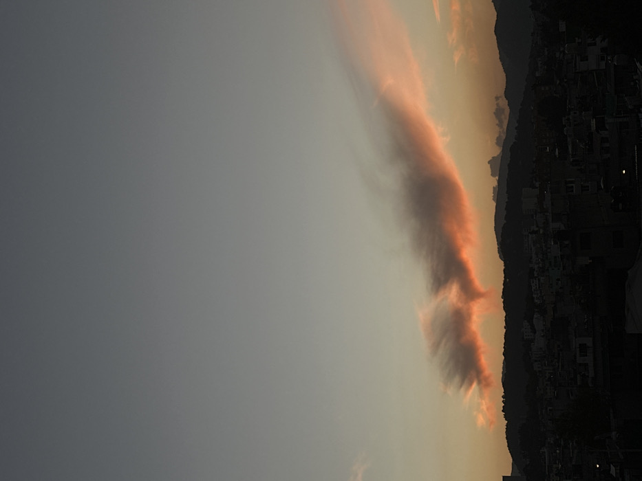 A sideways view of a sunset. A pink-tinted cloud stretches across the sky near a mountain range and a city with buildings of various heights. The sky transitions from gray to yellow. Buildings appear dark against the light sky.