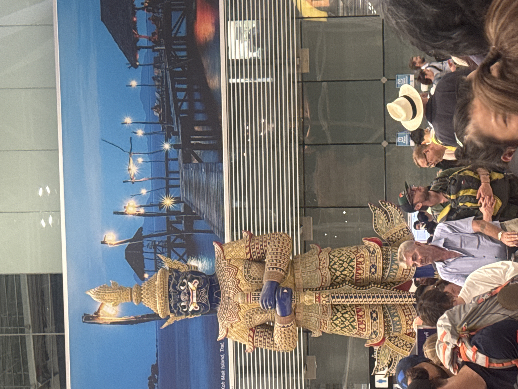 A large, ornate statue of a blue-faced, gold-armored giant guardian (Yaksa) stands prominently in an indoor public space within Nong Prue Subdistrict, Thailand. The statue wears a tall, pointed golden crown and traditional Thai attire with intricate patterns in gold, red, blue, and green. Its hands are clasped around a vertical sword or staff positioned centrally. Behind the statue is a large, illuminated mural depicting a picturesque evening scene of a wooden pier extending into calm water under a deep blue sky. The pier is adorned with numerous glowing lights on posts, and small thatched structures are visible, with people relaxing on lounge chairs. Text on the mural indicates "Koh Mak Island, Trat." The lower portion of the image shows a dense crowd of people, primarily adults of various ethnicities, standing and moving. Individuals are observed carrying backpacks, suggesting a travel context. Notable figures include a man in a light blue collared shirt looking to his right, and another man seen from behind wearing a cream-colored fedora. The environment features reflective glass panels and horizontal louvers above and below the mural.