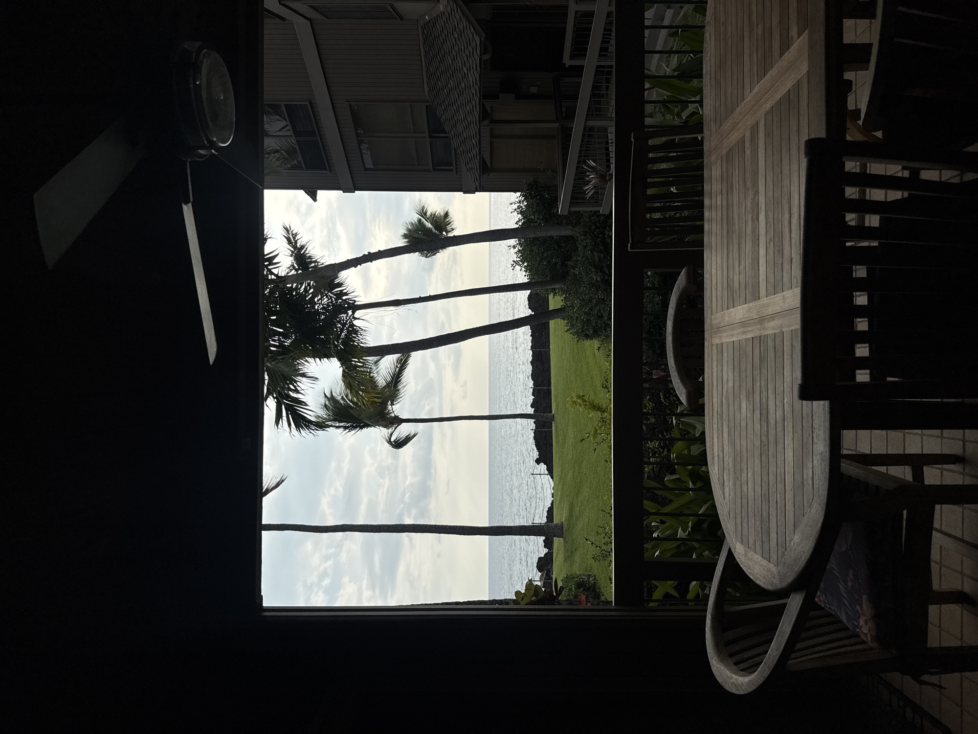 The image displays a coastal scene observed from a shaded outdoor lanai or patio in Kahaluu-Keauhou, United States of America. In the dark foreground, a rectangular wooden slatted table occupies the lower center, surrounded by several dark wooden chairs, one of which features a muted patterned cushion. A dark ceiling fan with a central light fixture is partially visible in the upper right portion of the shaded area. Beyond a dark railing, the brightly lit exterior reveals a meticulously maintained green lawn leading to a rocky shoreline. Numerous tall palm trees with slender trunks and green fronds are prominent across the lawn, bordering the ocean. The Pacific Ocean extends horizontally across the background, exhibiting subtle surface ripples under a partly cloudy sky. To the right, a multi-story building, clad in dark brown siding with a shingled roof, is visible, featuring multiple windows and an attached outdoor deck. No individuals are present in the scene.