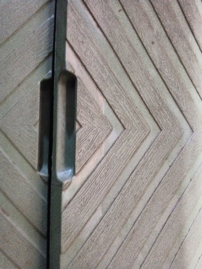A close-up shows a wooden cabinet door with a herringbone pattern