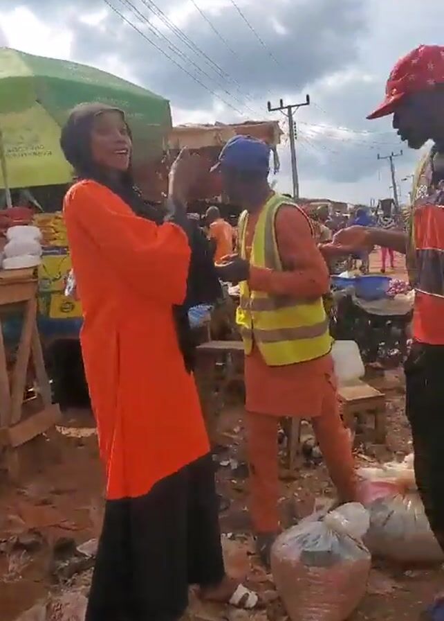 bustling outdoor market scene. A woman in an orange dress stands near a stall selling snacks and drinks under a green umbrella. The ground is littered with trash. The camera pans to show two men in reflective vests, one with a red hat, discussing something. They stand near a bag of peanuts on a dusty, red dirt road. The camera pans further to show a wider view of the market, crowded with people and vehicles, including a large truck in the distance. Vendors are selling various goods, including a large pile of onions. Many people are walking around, some dressed in traditional clothing. The overall atmosphere is lively and busy.