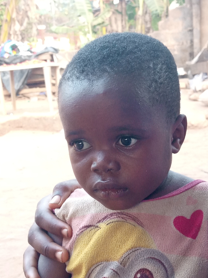A young child with dark skin gazes to the left with a somber expression. They have short, dark hair and a slight glisten around their nose. The child wears a pastel-colored shirt featuring a yellow, cartoonish image and a red heart. A dark hand gently rests on the child's shoulder. In the background, a blurred outdoor scene includes a table and vegetation, suggesting a rural or domestic setting.