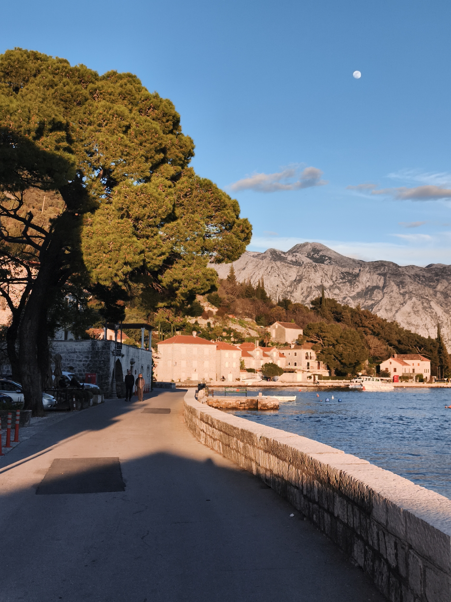 A photograph depicts a coastal scene with a paved road running alongside a stone wall that separates it from the sea. The road is partially shaded by a large tree to the left, which casts a significant shadow. Two individuals are walking along the road, further down the path. Several parked cars and a building with architectural details are visible beyond the tree. Across the water, several buildings are visible on a hillside, situated beneath a large, rocky mountain in the background. The sky is a gradient of blue, with the moon visible and a few clouds near the horizon. The water appears calm, with boats moored near the shore and buoys floating in the water. The location appears to be within the city of Unknown, Unknown.