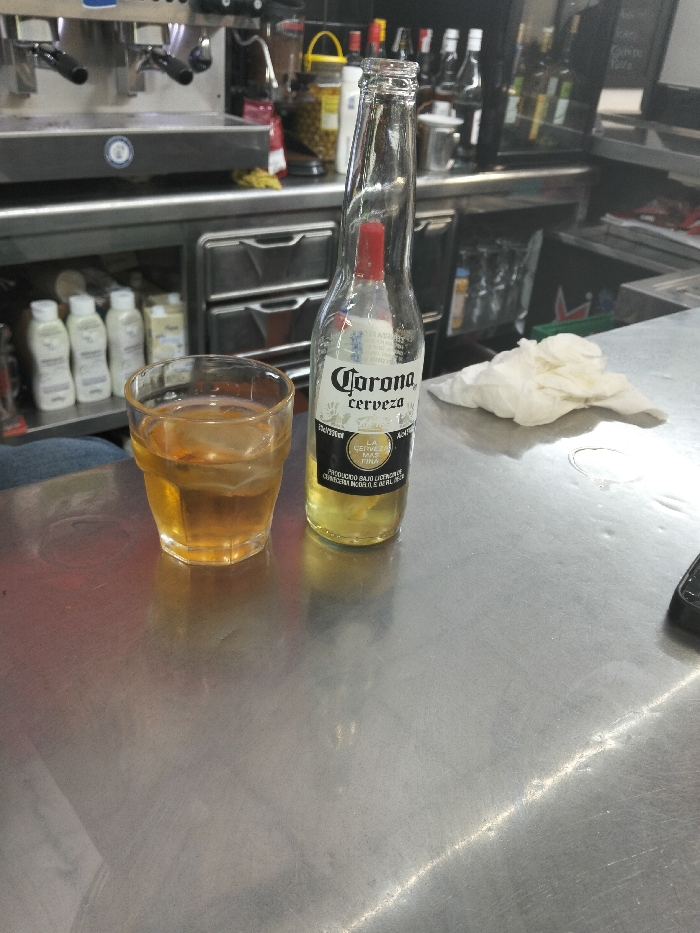 A mostly consumed bottle of Corona beer stands next to a glass filled with ice and a brown liquid. Both rest on a stainless steel countertop in a commercial setting. Behind them are bottles, storage drawers, a commercial espresso machine, and cleaning supplies. A white cloth sits crumpled to the right of the beer bottle. The countertop is smeared with wet spots.