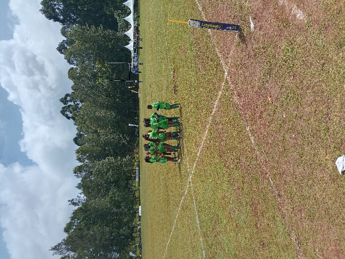The scene depicts an outdoor sports field in Meru, Kenya, under bright daylight and a partly cloudy sky