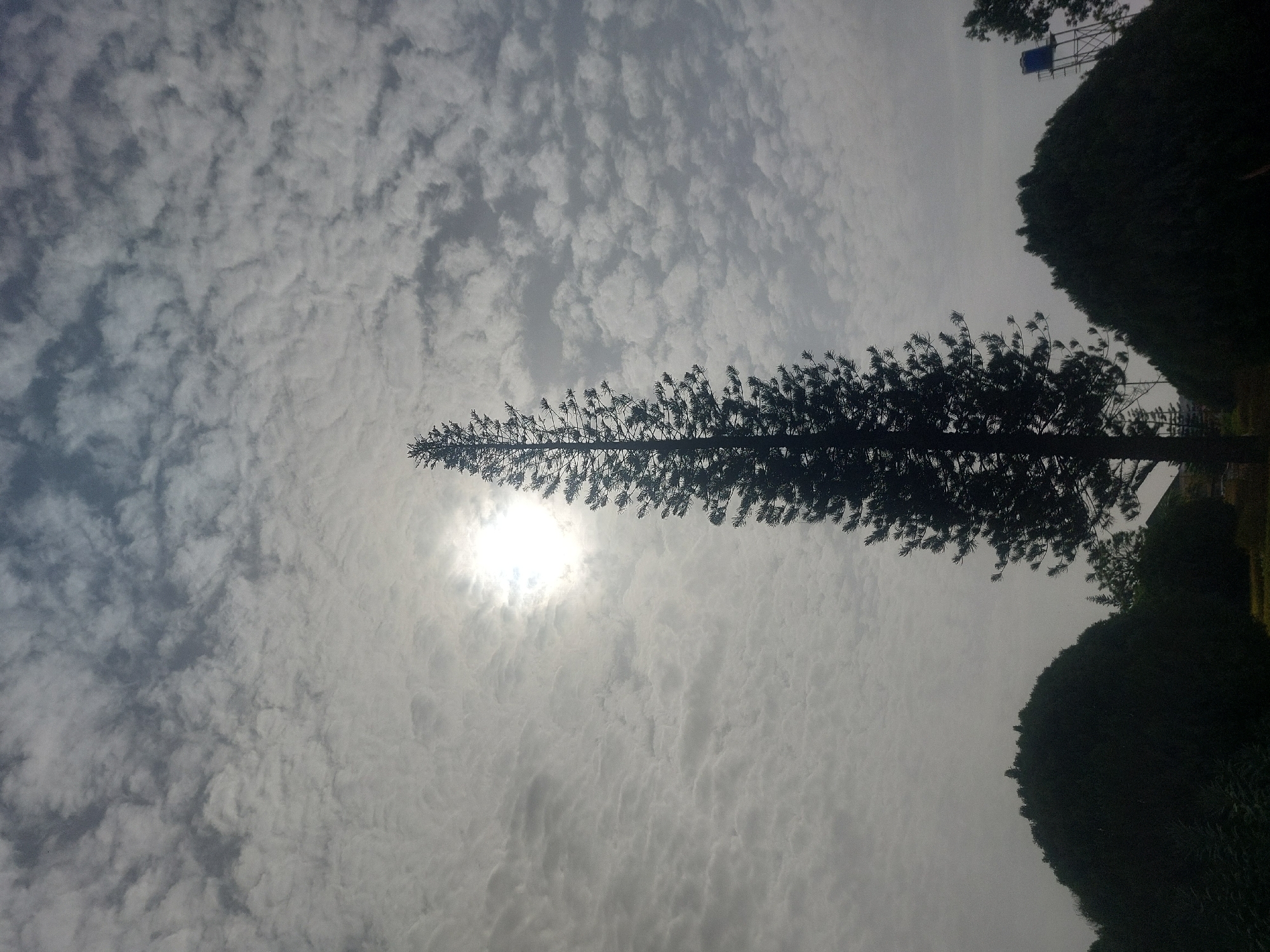 view towards the sky in Jos, Nigeria. The sky is filled with a layer of textured grey clouds. In the center, the sun shines through the clouds. A tall, thin tree extends horizontally across the center of the frame, partially obscuring the sun. To the right of the tree is a dense row of shorter, rounded trees or bushes. In the top right corner, a partially visible structure resembling a water tower is present.