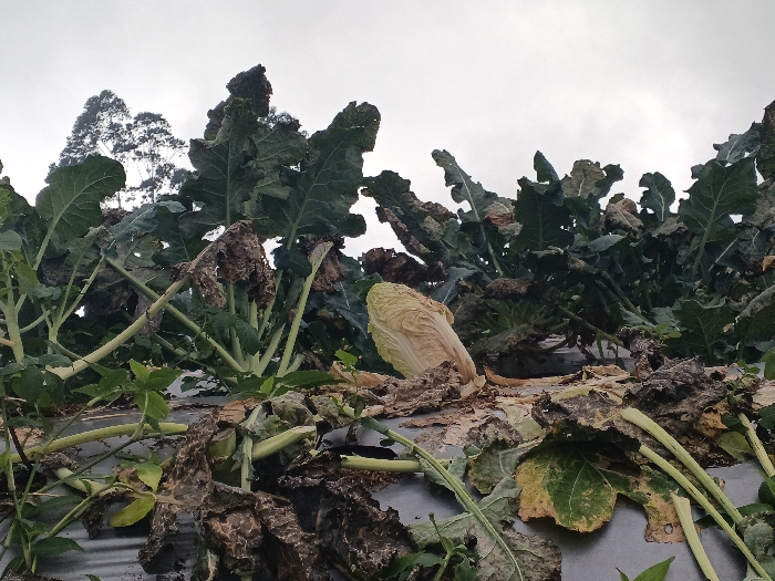 An agricultural field in Khna, Cambodia, is depicted under an overcast sky. The foreground and midground are dominated by numerous leafy green plants, consistent with broccoli or cauliflower, exhibiting extensive signs of decay, yellowing, and damage to their leaves. Several dried and broken leaves are scattered across the black plastic mulch covering the ground beneath the plants. To the center-right, a light-colored, elongated head of what appears to be a Napa cabbage lies detached on the mulch amidst the other vegetation. In the distant background, several tall, slender trees with minimal foliage are visible against the light grey sky. No individuals or active processes are observed.