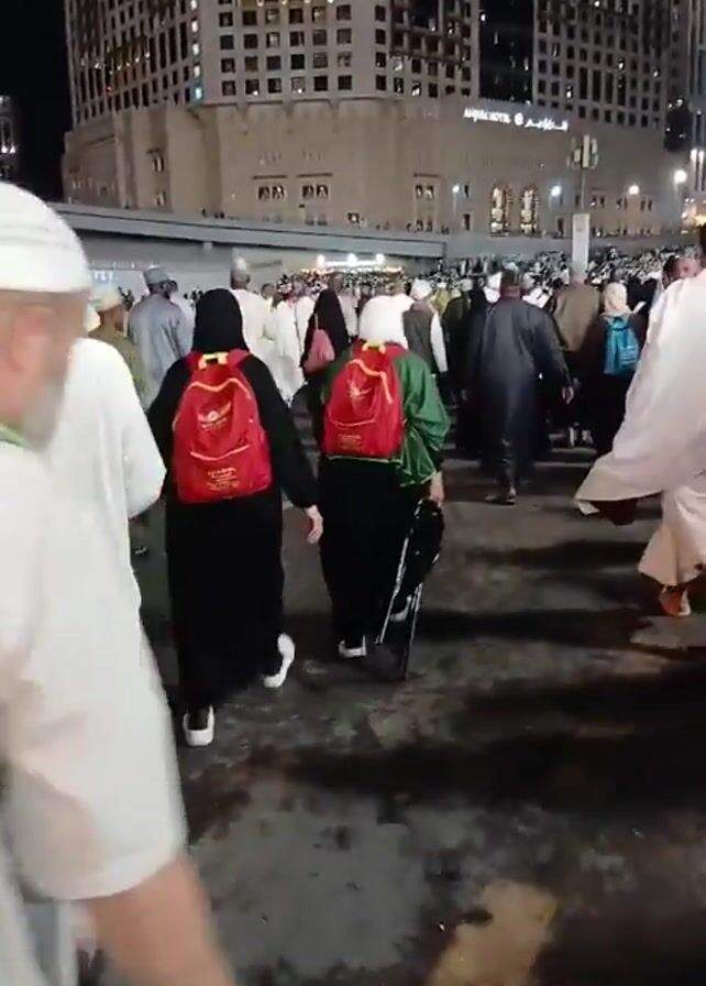 night scene in what appears to be a plaza area, possibly in Mecca, Saudi Arabia, with a large crowd of people moving about. Many of the people are wearing traditional Islamic clothing, including white robes for men and black abayas for women. Some individuals are carrying backpacks of various colors like red, green, and orange. The ground looks slightly wet, and there's litter visible. In the background, there are tall, modern buildings with multiple windows, suggesting a developed urban area. The lighting is provided by street lamps or building lights, giving the scene a bright, urban ambiance.