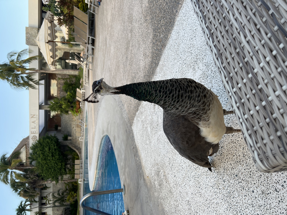 - "A peacock stands on a textured patio next to a pool" by FM-sBHb22, licensed under CC BY 4.0
