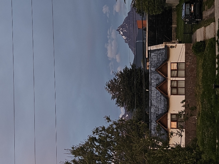A vertically oriented image depicts a serene dusk scene. A white house with a dark roof features several windows, some illuminated. A snow-capped mountain rises in the background, framed against a sky transitioning from blue to gray. Trees with full foliage line the foreground and partially obscure the house. Power lines stretch across the sky, adding an urban element to the natural landscape. A car and fence are visible on the right, hinting at a residential area.