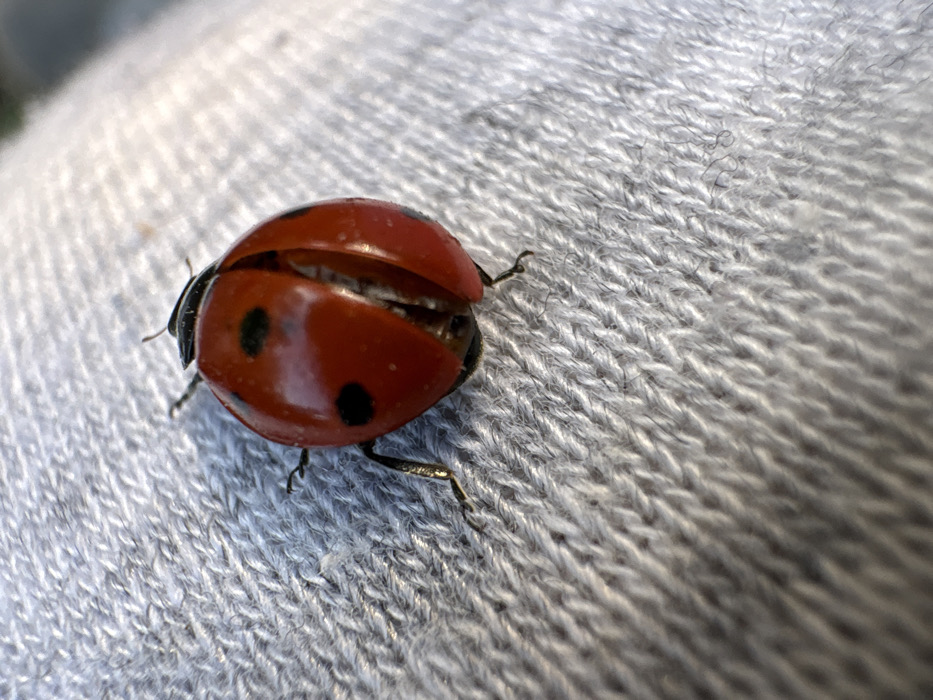 - "A close-up image presents a ladybug positioned on a light grey, tightly woven fabric, which appears to be textile material such as a sleeve or glove" by FM-kr1G73, licensed under CC BY 4.0