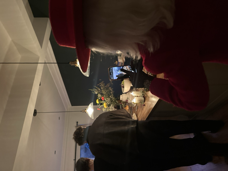- "A person dressed as Santa Claus takes a photo with their phone of a flower arrangement, candles, and other decorative objects on a kitchen island" by FM-13LyK2, licensed under CC BY 4.0