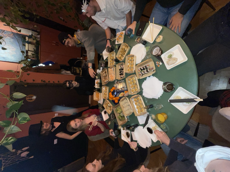 - "A group gathers around a large, round, green table laden with sushi in takeout containers" by FM-GgSpJ3, licensed under CC BY 4.0