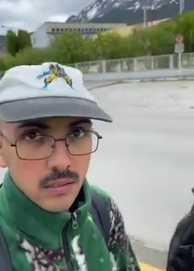 A man films himself and a woman walking on a sidewalk in front of a building with mountains in the background. The man has a mustache, glasses, a patterned fleece jacket, a baseball cap with a cartoon character, and a backpack. The woman has long dark hair and wears a jacket over a graphic tee. The man films himself then slightly rotates the camera to briefly show the woman walking alongside him. The sky is overcast.