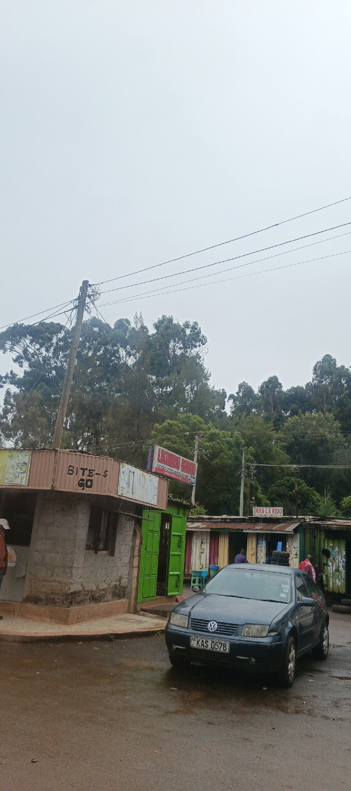 A cloudy day scene shows a dark blue Volkswagen car parked on a wet street. Behind the car are several small shops, one labeled "BITE-S GO" and another "DUKA LA VIDO". Trees fill the background, rising higher than the shops, and power lines stretch across the upper part of the frame. The overall atmosphere is muted due to the overcast sky.