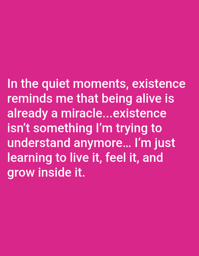 The image features white text against a solid pink background. The text conveys a reflective sentiment: "In the quiet moments, existence reminds me that being alive is already a miracle...existence isn't something I'm trying to understand anymore... I'm just learning to live it, feel it, and grow inside it." The overall tone is introspective and accepting, embracing the mystery of life and focusing on experiencing it fully rather than seeking to comprehend it entirely.