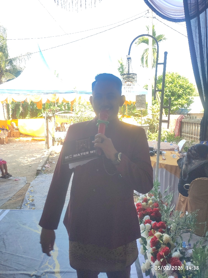 A man is standing in front of a flower arrangement and holding a microphone. He wears a dark red jacket and a patterned skirt. The background shows an outdoor event with a white tent and some decorative lighting. A table with a white tablecloth and water bottles is visible behind the man. The date 05/02/2026 and the time 14:38 are shown in the lower right corner.