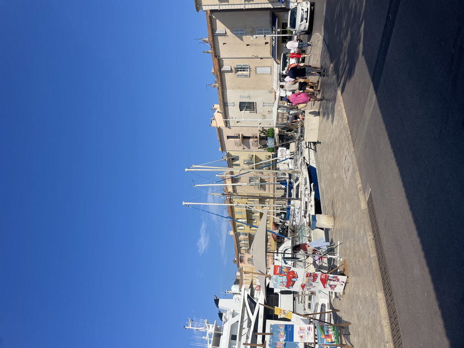 Boats of varying sizes, from yachts to sailboats, are docked along a concrete pier. Buildings with light-colored facades and windows line the pier. A group of people walks along the sidewalk alongside the buildings. Artworks are displayed for sale next to the boats. The sky is a clear, vibrant blue. A portion of the road is visible in deep shadow.