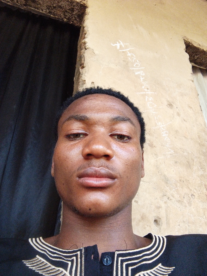 A close-up, chest-up portrait shows a young adult male of African descent, likely in Eziudo, Nigeria